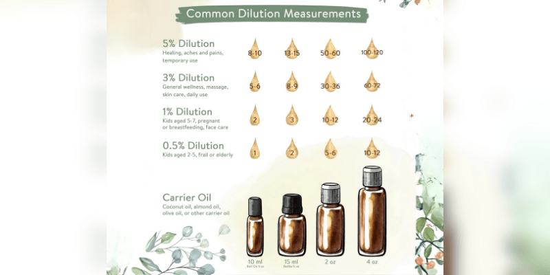 - Body / larger areas: 2–3% dilution (2–3 drops per teaspoon of carrier oil)