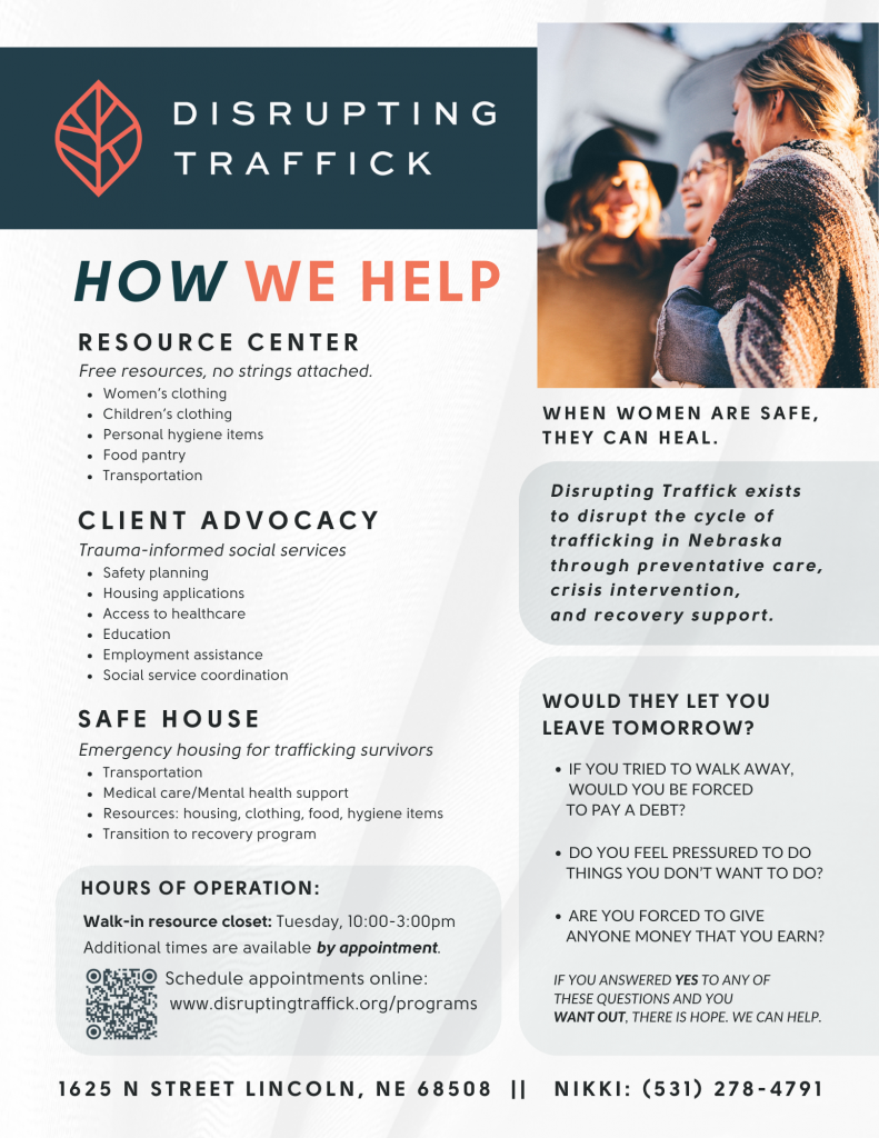 Disrupting Traffick is a Nebraska-based nonprofit dedicated to helping women who have experienced, or are at risk of, sex trafficking. Their programs focus on providing safety, connection, and long-term support so survivors can begin rebuilding their lives.